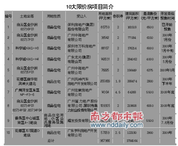 在這10宗限價(jià)房項(xiàng)目中,除了已經(jīng)開售的保利西子灣以外,還有中海地產(chǎn)在金沙洲的金沙馨園和萬(wàn)科地產(chǎn)在開發(fā)區(qū)的新里程兩個(gè)項(xiàng)目即將在今年1月開售。此外,和萬(wàn)科新里程項(xiàng)目鄰近的廣東龍光集團(tuán)開發(fā)的限價(jià)房項(xiàng)目有望在今年5月份開售,該項(xiàng)目最高限價(jià)為4000元/平方米。其余限價(jià)房項(xiàng)目有望在今年下半年或年底前開售,而廣東亨利房地產(chǎn)開發(fā)有限公司去年底在花都107國(guó)道附近拿下的限價(jià)地要到2009年才能建成銷售。