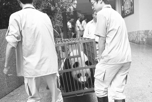 下午2時,運輸車輛經(jīng)過安檢、消毒后,從上海野生動物園啟程,3時到達上海動物園。在臥龍大熊貓保護研究中心的主管見證下,經(jīng)過上海動物園和上海野生動物園共同檢查,確認無誤,完成動物交接。隨后,工作人員開始為熊貓串籠。10只世博熊貓似乎知道要搬新“家”,乖乖地在飼養(yǎng)員誘導下,一個個按照指令很爽快地進入消毒過的籠“轎”內(nèi),安穩(wěn)地等候上車。