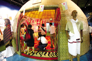 外墻頂部覆蓋著手編織帶,兩壁腰墻和地面分飾有手編掛毯和地毯,內(nèi)墻上掛有圖案抽象的繪畫和手工藝品,小小民居包羅萬象——一走進(jìn)非洲聯(lián)合館內(nèi)的吉布提館,就能見一座蝸形民居“浮于水上”。這是吉布提游牧民族阿法爾人的傳統(tǒng)民居,叫“達(dá)布瓦塔”。上海世博會上的這個72平方米大小的達(dá)布瓦塔,全系在吉布提國內(nèi)造好再裝進(jìn)集裝箱漂洋過海而來,所以俱是原汁原味的吉布提當(dāng)?shù)仫L(fēng)情。