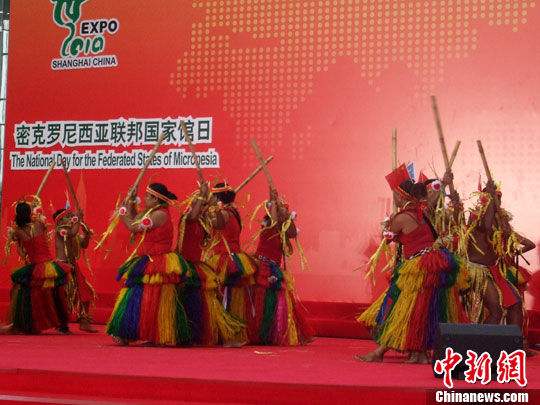 中新社上海8月29日電 (記者 鄭瑩瑩)以熱帶風情著稱的太平洋島國密克羅尼西亞29日迎來國家館日。在官方儀式上,數(shù)十名島國舞者穿著及踝草裙,手持竹竿相互敲打,以原生態(tài)歌舞展現(xiàn)島國熱情奔放的民俗風情。