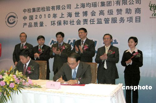 一月十八日,效法北京奧運模式,中國檢驗認(rèn)證集團有限公司在上海與中國二0一0年上海世博會特許產(chǎn)品生產(chǎn)高級贊助商簽署世博特許產(chǎn)品質(zhì)量、環(huán)保監(jiān)管服務(wù)項目協(xié)議。圖為世博會高級贊助商之一的上海均瑤(集團)有限公司與中檢集團簽約。結(jié)合北京奧運會特許產(chǎn)品質(zhì)量監(jiān)控經(jīng)驗,未來中檢集團將對上海世博會各大類特許產(chǎn)品實行原料、生產(chǎn)、加工、管理、包裝及銷售的全流程質(zhì)量控制,包括對上海世博會吉祥物“海寶”衍生產(chǎn)品的質(zhì)量監(jiān)控。中新社發(fā) 許曉青 攝