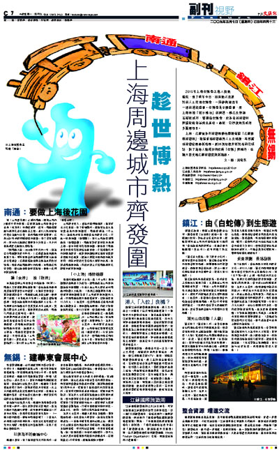 香港文匯報報道稱,世博會是全國盛事,而上海周邊“近水樓臺”的南通、鎮(zhèn)江及無錫等鄰近城市,都想借世博會,把各自的旅游和商貿(mào)經(jīng)濟效益推至高峰。最近,它們便剛完成很多配套項目。