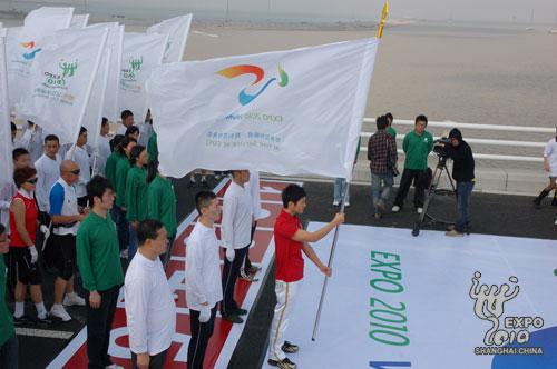 共青團(tuán)上海市委書記、上海市世博會(huì)籌備工作領(lǐng)導(dǎo)小組志愿者組副組長潘敏為“大橋跑”發(fā)令起跑。起跑前,21名少女手捧取自沿長江21個(gè)城市采集而來的母親河水水樣,匯入長江入?,表達(dá)了志愿者的拳拳赤子之心,也表達(dá)了志愿者對上海世博會(huì)的美好祝愿。