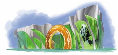 進(jìn)入拱門,參觀者將遇見歡迎八方來賓的大熊貓“歡歡”。通過多媒體播放,這位迎賓者傳遞出四川人民的熱情。 “歡歡”也是人們整個(gè)參觀過程中的導(dǎo)游,會在各個(gè)展區(qū)的多媒體視頻上出現(xiàn)。