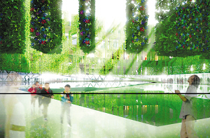 “建筑內(nèi)部的綠色立體園林,也使用了可降解、可循環(huán)的材料,以盡可能達(dá)到最大限度的環(huán)保。這些綠色的植物,除了可以讓人們親近自然,還能夠幫助調(diào)節(jié)室內(nèi)溫度,讓參觀者更加舒適。屋頂?shù)奶柲茈姵匕,則提供了清潔而免費的能源。”方可說。