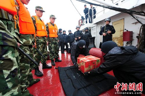 中新網(wǎng)舟山4月27日電(記者 趙曄嬌 通訊員 包能偉)昨天下午2時,浙江省舟山市定海區(qū)公安、海事、港航、海洋與漁業(yè)、邊防等多部門聯(lián)合舉行“清!笔啦┌脖B(lián)合演練。本次模擬警情為一名在定海農(nóng)村宕口做爆破員的犯罪嫌疑人,私自截留了10公斤炸藥,企圖帶往上海金山幫助一不符合爆破條件的工地進(jìn)行爆破作業(yè)。