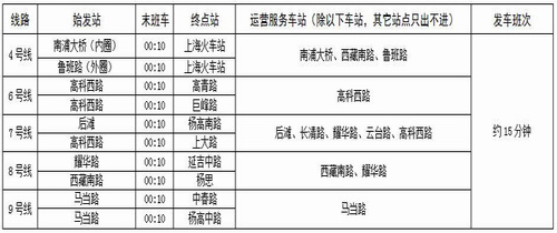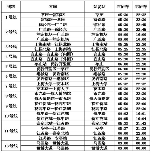 軌道交通4、6、7、8、9五條涉博線路在常規(guī)末班車后,將在世博園周邊站點(diǎn)加開加班列車,除重點(diǎn)涉博車站以外,其他途經(jīng)車站只可下客出站,不可進(jìn)站上客和換乘。加開列車末班車時(shí)間為0:10,運(yùn)營(yíng)間隔約為15分鐘一班。具體車站的首末班車時(shí)間還可查看各車站公告、至上海地鐵官網(wǎng)(/) 進(jìn)行查詢或撥打地鐵服務(wù)熱線64370000進(jìn)行詢問(wèn)。