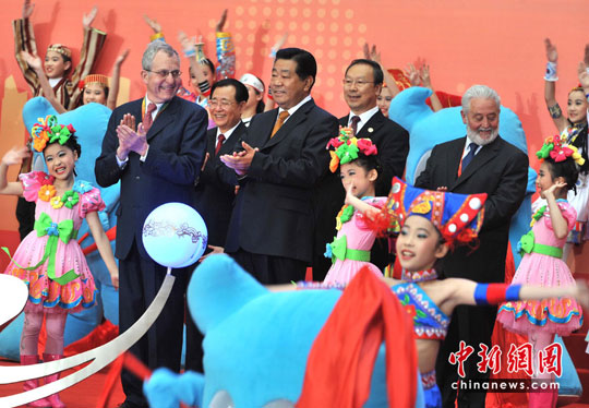 1日上午八時半,上海世博會開園儀式在世博中心舉行。上海市市長韓正主持儀式。全國政協(xié)主席賈慶林、國際展覽局主席讓·皮埃爾·藍(lán)峰、全國政協(xié)副主席王剛、國務(wù)院副總理王岐山、全國政協(xié)副主席杜青林、全國政協(xié)副主席錢運錄、國際展覽局秘書長洛塞泰斯等來賓一道出席開園儀式。