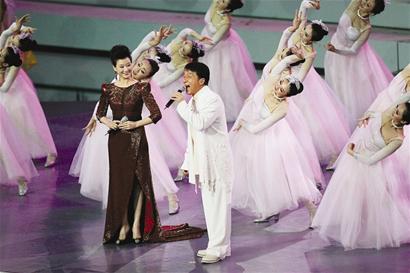 約半個(gè)小時(shí)的開(kāi)幕式演出,聚合了五大洲的頂級(jí)明星,星光璀璨照耀浦江。在嘉賓入場(chǎng)后,由上海大學(xué)生組成的800人合唱團(tuán)唱起一曲《和諧歡歌》,“鮮花簇?fù)砑s定地方,熟悉沒(méi)見(jiàn)過(guò)的臉龐,呼喚聽(tīng)見(jiàn)心靈激蕩,邀世界分享……”著名歌唱家宋祖英和國(guó)際巨星成龍攜手出場(chǎng),為本次世博會(huì)開(kāi)幕唱響第一個(gè)強(qiáng)音。