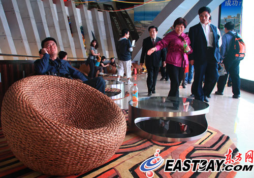 以“崛起的大國(guó)”為主題的南非館這次完全舍棄了野生動(dòng)物、美麗風(fēng)光等常態(tài)化展示,而是用一個(gè)球形的視頻墻占據(jù)在展館中央,四周圍放置著竹編的各式藤椅。負(fù)責(zé)籌建和部分設(shè)計(jì)的南非館的中方負(fù)責(zé)人黎先生告訴東方網(wǎng)記者,由于南非館將在世博會(huì)期間進(jìn)行五大主題的展示,“只有視頻能夠最好展現(xiàn)出來(lái)!