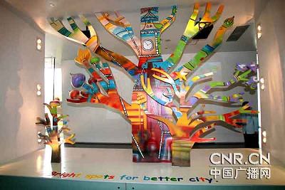 講解員說(shuō)這些東西取材于俄羅斯全國(guó)兒童繪畫(huà)大賽的獲獎(jiǎng)作品,他們共同的主題是《我眼中的最佳城市》:一座座房子蓋在烏龜上,城市可以移動(dòng);有的樹(shù)上也蓋了房子,張開(kāi)的樹(shù)枝就是一條條馬路。孩子們心中的未來(lái)城市真是充滿了想象力和童趣,這樣的設(shè)計(jì)也受到了正在參觀的孩子們的喜歡。