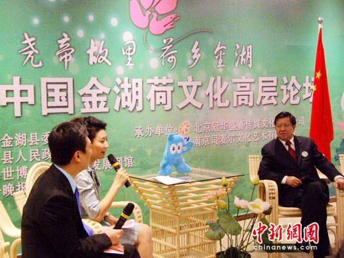 本屆論壇是第十屆中國金湖荷花•美食節(jié)的高端活動之一,借助世博會的平臺,讓荷文化作為金湖的形象大使,牽手世博,走向國際,發(fā)展金湖。論壇一改過去嘉賓輪流上臺發(fā)言的設(shè)計,采用央視訪談欄目的場景設(shè)計和節(jié)目流程,由央視名嘴陳偉鴻、王小丫現(xiàn)場主持。出席論壇的嘉賓們在主持人的引導(dǎo)下,聯(lián)系金湖發(fā)展和各自實際,圍繞“荷”氣生財論經(jīng)濟、以“荷”為媒說規(guī)劃和政通人“荷”談民生三大論題進行現(xiàn)場訪談。