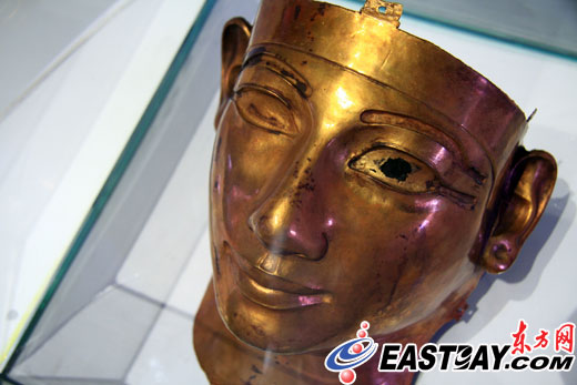 據(jù)介紹,“法老舍松契二世面具”誕生于公元前890年,在東尼羅河三角洲地帶被發(fā)現(xiàn)。黃金面具的左眼有一塊黑色,類(lèi)似于眼珠,工作人員告訴東方網(wǎng)記者,可能是彩色涂料的殘留物,“這個(gè)面具的眼睛、眉毛等處在當(dāng)時(shí)應(yīng)該有被涂上彩色顏料!