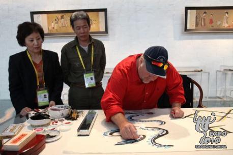 除制瓷以外,參觀寶鋼大舞臺的外國游客還常常熱衷于剪紙、織錦、皮影、旗袍等中國傳統(tǒng)文化,常常盯著一件作品看上老半天,如果碰巧遇上創(chuàng)作演示,更是不看到成品不罷休。每逢這時,獻藝的各位工藝大師總是會熱情地邀請他們親自試一試,剪下一朵花,或畫下一尾魚,體驗中國文化的奇妙。大師們頗有心得地說,語言不是障礙,微笑就是最好的溝通。