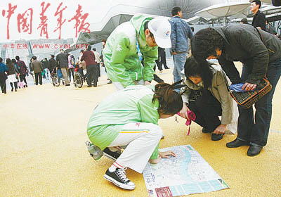 中國館南廣場上的30名首批志愿者都是來自復旦大學的學生。他們的工作在很多人看來很簡單,就是疏導游客,給游客指路。他們每天要重復幾萬次的回答就是:“對不起,預約券已經(jīng)發(fā)完了”,“您好,請往這邊走”……“現(xiàn)在我已經(jīng)不用看地圖就能清楚地給游客指路了。以前還不熟悉的時候,我利用休息的時間不斷地看地圖,已經(jīng)翻爛了兩份地圖,這是第三份了!卞X琲從包里翻開她的園區(qū)地圖,這一份也已經(jīng)快被她翻爛了,快斷裂的地方她用透明膠布粘著。