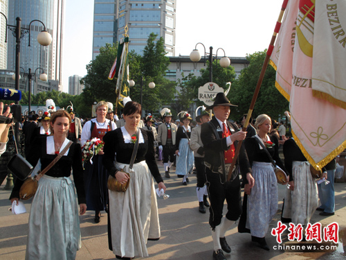 中新網(wǎng)南京5月23日電(申冉 閆正偉)今天下午,南京市中心山西路的市民廣場上空飄蕩著來自奧地利美麗山崗原野間的優(yōu)美圓舞曲,穿著奧地利民族服裝的奧地利施瓦茨市長樂團樂手們帶著他們淳樸悠揚的旋律和歡快自由的舞步,給南京市民送來了一個充滿著奧地利音樂狂歡節(jié)日氣氛的初夏周末。