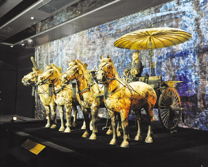 秦俑館銅車馬共兩乘,此次在中國館展出的“一號(hào)銅車馬”為雙輪、單轅、駟馬系駕,總重約1061公斤。主體為青銅所鑄,通體飾有精美彩繪,配有1000多件金銀配飾。“一號(hào)銅車馬”在中國館“國之瑰寶”展區(qū)展出,展示將持續(xù)到世博會(huì)閉幕。