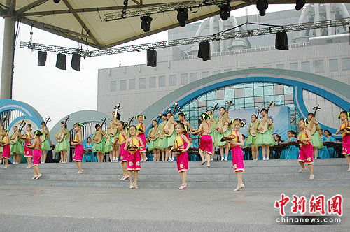 中新網(wǎng)上海6月27日電(趙龍)行云流水的古箏、歡快奔放的二胡、委婉鏗鏘的琵琶……今日伴著淅淅瀝瀝的雨聲,百余名蘇州少年帶來的“琴瑟滄浪”民樂演奏音樂會(huì),在世博園全球城市廣場(chǎng)奏響,讓中外觀眾領(lǐng)略了一把中國(guó)傳統(tǒng)民樂的魅力。