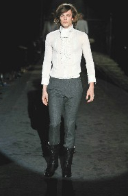 要表現(xiàn)貴公子獨(dú)特風(fēng)味,垂墜在前襟最為妥當(dāng),或是嘗試把絲巾系在頸邊、手腕邊,也可以試試外繞在金屬腰帶上,或干脆讓絲巾隨著步伐在腰際擺動(dòng)飄逸。絲巾質(zhì)感輕柔,和秋冬大量出現(xiàn)的華麗搖滾有剛與柔、動(dòng)與靜對(duì)應(yīng)的美感,更加突顯秋冬流行潮流。