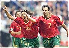 在專家的眼里,本屆世界杯最有力的冠軍爭(zhēng)奪者將是法國(guó)隊(duì)、阿根廷隊(duì)、意大利隊(duì),緊隨其后的就是葡萄牙隊(duì)。該隊(duì)后衛(wèi)線堅(jiān)固,中場(chǎng)組織嫻熟,攻擊非常銳利。效力于皇家馬德里隊(duì)的路易斯-菲戈,AC米蘭隊(duì)的10號(hào)球星魯伊-科斯塔,國(guó)際米蘭隊(duì)的孔塞桑等組成的中場(chǎng),與法國(guó)隊(duì)和阿根廷隊(duì)一起被稱為世界最強(qiáng)陣容之一。在鋒線上他們有波爾多隊(duì)的保萊塔、里斯本競(jìng)技隊(duì)的若昂-平托以及佛羅倫薩隊(duì)的小將戈麥斯,火力非常兇猛。以點(diǎn)球負(fù)于對(duì)手,不得不排在第4名,這可以說(shuō)是葡萄牙隊(duì)為2002世界杯進(jìn)行的一場(chǎng)預(yù)演。在專家的眼里,本屆世界杯最有力的冠軍爭(zhēng)奪者將是法國(guó)隊(duì)、阿根廷隊(duì)、意大利隊(duì),緊隨其后的就是葡萄牙隊(duì)。
