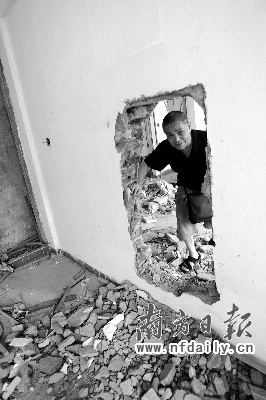 “目前24棟已經(jīng)完全被拆除,25、26、27棟主體結(jié)構(gòu)被破壞,29棟拆成了‘神仙洞’,31棟拆得漏雨,被稱為‘水簾洞’,幾十戶只好出去租房。在2009年11月還有50余戶居住、30多戶業(yè)主未簽約的情況下就開始拆遷,破壞小區(qū)達(dá)74天之久,已經(jīng)嚴(yán)重違法!鳖櫹壬硎。