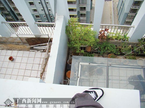 7月13日上午,記者再次來到該小區(qū)事發(fā)居民樓四棟一單元,在一名保安的指引下,乘坐電梯到了樓頂天臺(tái)。從天臺(tái)上可以看到,頂層兩戶居民家的露臺(tái)除了架設(shè)的擋雨玻璃層外,沒有任何防護(hù)設(shè)施,從天臺(tái)上就可以輕易翻入露臺(tái)。帶記者查看現(xiàn)場(chǎng)的保安說,小偷就是從乘電梯上天臺(tái),然后跳入露臺(tái)潛入居民房?jī)?nèi)的。
