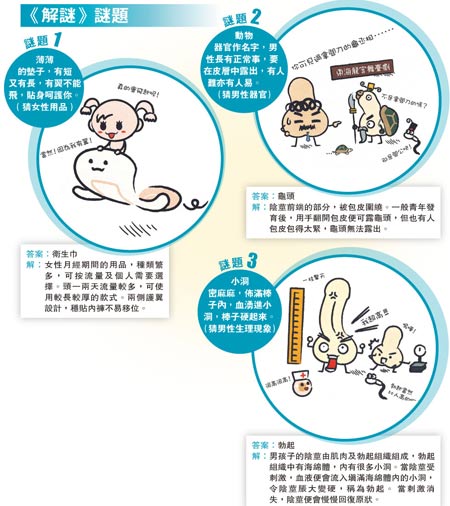 負(fù)責(zé)策劃《解謎》的家計(jì)會(huì)教育干事陳耀杰表示,《解謎》的版面設(shè)計(jì)十分可愛,從封面到內(nèi)頁都輔以不少生動(dòng)的漫畫,希望吸引小朋友閱讀,該書采一問一答形式,方便家長和教師與小朋友打開話題,輕松無尷尬地談性,“家長可先猜猜謎,由謎語游戲開始,玩一會(huì)才向子女灌輸性教育”。