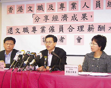 工聯(lián)會屬會香港文職及專業(yè)人員總會權(quán)益委員會在去年9至11月,成功訪問735名會員,包括銀行、證券、保險、會計、教育等從業(yè)人員,結(jié)果發(fā)現(xiàn):60%人去年獲加薪,另有分別33.3%、22.4%和21%受訪者說,會因“薪酬缺乏吸引力”、“同工不同酬”和“工時越來越長”而考慮轉(zhuǎn)行或轉(zhuǎn)工,大多人表示會考慮投身金融界,如證券、銀行、地產(chǎn)、會計等。