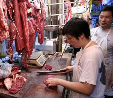 “資料圖:2007年8月23日”香港五豐行決定再調(diào)高活牛批發(fā)價后,2007年8月23日,有街市肉檔將零售價調(diào)高10%,但來貨量仍然緊張。據(jù)鮮肉大聯(lián)盟主席文灼培當(dāng)日表示,五豐行只有38只內(nèi)地活牛到港。 中新社發(fā) 譚達(dá)明 攝