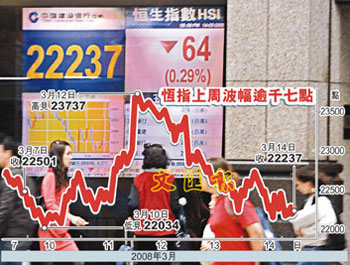 中新網(wǎng)3月17日電 據(jù)香港文匯報報道,受到貝爾斯登資金周轉(zhuǎn)不靈的消息拖累,美股大插近200點,一眾以美國預(yù)托證券(ADR)形式上市的港股也全線受挫。有香港證券界人士預(yù)計,18日港股將低開約500點,即下試今年低位21709點。