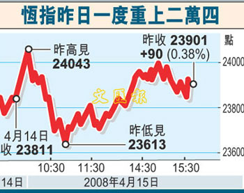 中新網(wǎng)4月16日電 據(jù)香港文匯報報道,大市缺乏方向,港股表現(xiàn)反復(fù)。15日大市高開139點后,一度重上24000點關(guān)口,但其后在高位沽壓顯著增加,恒指收市升90點至23901點,成交縮減至714.5億元。分析員指,大市仍未能突破250天線,料短期內(nèi)大市仍在22000-25000點徘徊。
