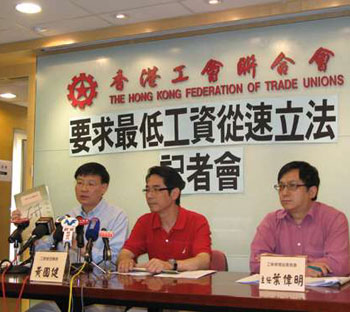 工資保障運動推行超過年半以來成效不彰,立法規(guī)管最低工資似乎勢在必行。工聯(lián)會理事長黃國健、立法會議員王國興和權(quán)益委員會主任葉偉明9日一同召開記者會,公布該會研究部就立法規(guī)管最低工資的研究結(jié)果。