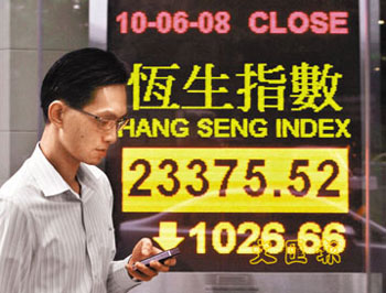 港股10日低開700多點后持續(xù)下瀉,午市后隨內(nèi)地A股跌幅加深,續(xù)擴大至逾千點,并以接近全日低位收市,大跌1026.6點或4.21%,收報23375.5點,是3個月來最大點數(shù)跌幅,成交大增39%至821.5億元。