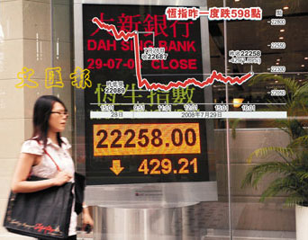 中新網(wǎng)7月30日電 據(jù)香港文匯報(bào)報(bào)道,富昌證券總經(jīng)理藺常念表示,國際貨幣基金會(huì)(IMF)唱淡美國樓市,反映美國樓市問題未解決,加上美林再錄巨虧,需要集資85億美元。若次按問題延續(xù),對各地股市都會(huì)有所打擊,也會(huì)影響港股表現(xiàn)。他個(gè)人仍維持看淡港股后市的預(yù)測,估計(jì)恒指短期有機(jī)會(huì)下試21000點(diǎn)。