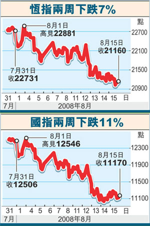 港股上周下跌725點(diǎn),跌幅3.3%。大福資料研究高級(jí)經(jīng)理曹福達(dá)表示,港股正處于熊市二期,走勢相當(dāng)反復(fù),但相信在奧運(yùn)后,股市有較顯著的反彈,而交投也將會(huì)再度活躍,令后市走勢明朗化。