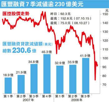 美國(guó)樓市持續(xù)下滑,愈來(lái)愈多人加入失業(yè)大軍,令匯豐按揭和信用卡貸款壞帳增加,第三季個(gè)人消費(fèi)融資的貸款減值損失,較上季增加7億美元,增至43億美元。