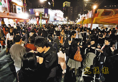 香港工展會會場內(nèi)人頭涌涌,在平安夜中,更愈夜愈精彩。面食、醬油及日常用品銷售仍然暢旺,而售賣應(yīng)節(jié)物品的攤位更受入場人士歡迎。