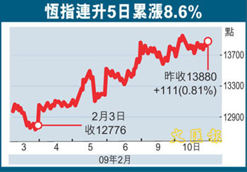 中新網(wǎng)2月11日電 據(jù)香港《文匯報》報道,港股連升5天,合計共升約1100點,恒指10日收報13880點,升111點,成交421億。內(nèi)地傳出振興石化行業(yè)計劃,包括提高暴利稅起征點,石油股上升,加上內(nèi)地股市升勢強(qiáng)勁,有證券界人士認(rèn)為市場在觀望美國通過救市方案后,恒指短期內(nèi)有機(jī)會上試14000點。