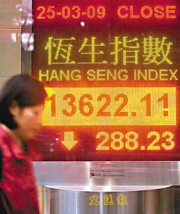 中新網(wǎng)3月26日電 據(jù)香港《文匯報(bào)》報(bào)道,近日造好的歐美股市周二晚回吐,港股25日跟隨外圍低開156點(diǎn)后,跌幅曾一度收窄,中午收市僅跌73點(diǎn),但A股午后急“插水”,令港股沽壓再度加劇,臨近收市前更跌逾300點(diǎn),恒指全日收?qǐng)?bào)13622點(diǎn),跌288點(diǎn),成交額542億元。
