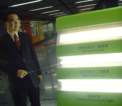 港鐵去年初耗資四百萬港元,在港島、荃灣及將軍澳三趟市區(qū)地鐵列車進行車廂LED環(huán)保燈測試計劃,港鐵總結稱,測試收到良好效果,除能有效節(jié)省能源外,LED燈的壽命較傳統(tǒng)光管耐用高四倍,達五萬小時,且更換時只需換走芯片便可,不會釋放水銀和制造光管垃圾。同時LED光線更接近自然日光,并不會釋放紫外光,可保護乘客眼睛,在測試期間廣為乘客歡迎。
