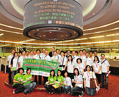 中新網(wǎng)5月31日電 據(jù)香港文匯報(bào)報(bào)道,港交所參與由非牟利機(jī)構(gòu)公益企業(yè)舉辦的2010年“雇員義工周”。日前于港股收市后,港交所行政總裁李小加與董事會(huì)成員、高級(jí)行政人員及港交所的義工,到交易大堂及港交所的各辦公地點(diǎn)義賣(mài)“樂(lè)施米”,以支持為幫助內(nèi)地扶貧工作的“樂(lè)施米義賣(mài)大行動(dòng)”。