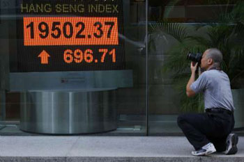 香港股市20日跟據(jù)外圍高開200點(diǎn),輕易升破19000點(diǎn)關(guān)口拾級而上,中午收市升447點(diǎn),在深滬股市推波助瀾之下,港股午市升勢持續(xù)擴(kuò)大,最多升700點(diǎn),金融股及地產(chǎn)股齊齊為股市添動力,指數(shù)以接近全日高位收市,報19502點(diǎn),上升696點(diǎn)或3.7%,多只藍(lán)籌股重返去年由雷曼爆煲引發(fā)的金融海嘯前水平,國企指數(shù)升幅超過4%或446點(diǎn),收市報11593點(diǎn)。