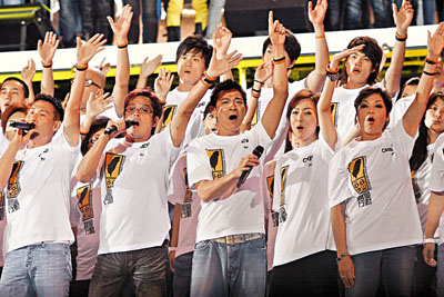 沒人歡呼,沒人揮動熒光棒,萬人聚集在一起,并不是欣賞精彩表演,為的只是告訴臺灣受臺風吹襲的災民,他們在困境中并不孤獨;為的只是從心中呼喊一聲:“臺灣加油!”