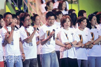 嫁給臺灣富商鄭翔中后,移居當?shù)?3年的前港姐李美鳳,不單捐出一對子女的利是錢,更即場除下手上的價值10多萬的鉆石表義賣。愛心是無價的,所以她不設(shè)底價。鄭秀文與劉德華合唱《喝彩》,她說:“天災無法避免,人類好渺小,要正面態(tài)度去面對,要帶著勇氣活下去,黑暗過后一定有陽光!”還有藝人狄波拉、陳奕迅、方力申、劉璇等,也充當接線生出力籌款。