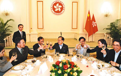 曾蔭權(quán)5日在禮賓府筵開(kāi)5席,來(lái)自各黨各派的約40名議員依時(shí)赴會(huì),財(cái)政司司長(zhǎng)曾俊華、律政司司長(zhǎng)黃仁龍及大部分局長(zhǎng)和副局長(zhǎng)也同為座上客。據(jù)引述,曾蔭權(quán)在午宴上致辭時(shí)向議員們笑說(shuō),議事之外都有人情,火花之外都有風(fēng)花雪月,5日的宴請(qǐng)是希望大家除了公事之外,也有多些溝通和交流。