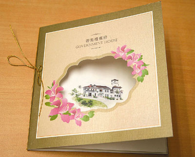 該賀卡由特區(qū)政府新聞處設(shè)計(jì),封面是香港市花洋紫荊襯托下的禮賓府全景油畫,卡內(nèi)寫上“恭賀新禧”及“Wishing you a Happy and Properous New Year”,并由曾蔭權(quán)簽名,誠(chéng)意十足。