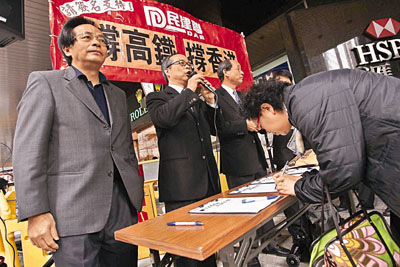 民建聯(lián)在本周二開始在港島、九龍、新界發(fā)起“撐高鐵、撐香港”的簽名活動,截至14日,最少有逾3萬名市民簽名支持。中環(huán)14日短短一小時已經(jīng)收集到1100個簽名,清楚反映市民希望建高鐵的訴求。