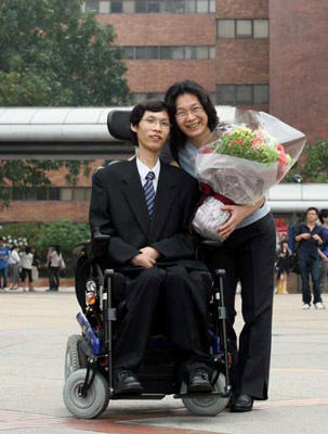 一直坐在講堂最后一排角落的劉媽媽,在掌聲簇?fù)硐伦呱吓_,沒有擁吻,沒有感言,她輕輕幫兒子捋順頭發(fā),母子二人相視一笑,神情和默契,足以勝過任何言語行動。