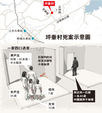 2時許,同事趕到坪輋村譚家時,發(fā)現(xiàn)一名可疑男子在石屋前泥地掘坑有所動作,感覺不妙,于是立即報警。其間疑人發(fā)現(xiàn)行藏敗露,立即跑到附近一間村屋匿藏。警員接報馳至,發(fā)現(xiàn)泥地上有可疑血漬,立即召消防到場協(xié)助,消防員將泥土的表層翻開,見2具男女大人,以及2具女童的尸體,由于4名死者已無生命跡象,警方立即封鎖現(xiàn)場,以待7日進一步挖掘調(diào)查。