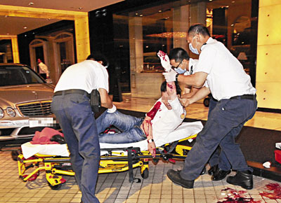 現(xiàn)場為尖東么地道香格里拉酒店門外,4日凌晨4時許,“泰龍”偕一男友人在酒店消遣后離開,行至酒店大門外分頭各自取回一輛名貴平治房車和一輛保時捷跑車,當“泰龍”剛走到平治座駕旁,突有2輛車從前后高速駛至,其中一輛7人車從酒店行車通道入口直沖向他,“泰龍”閃避不及被撞至飛彈落地。另一輛私家車則從通道出口逆線駛?cè),車上跳?名分持開山刀殺手,直撲“泰龍”揮刀狂砍。